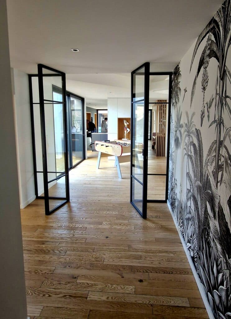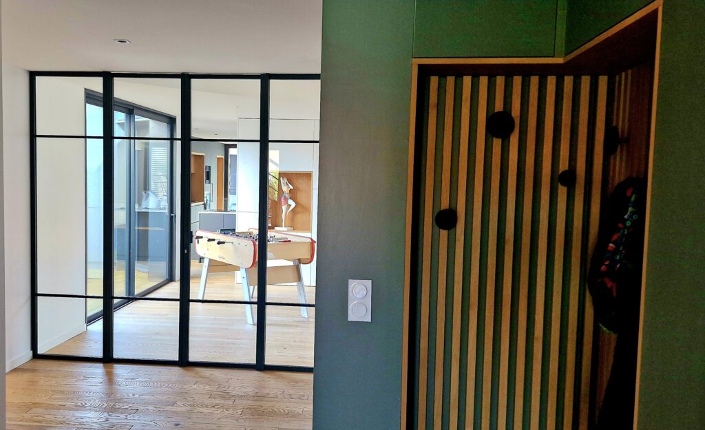 Dans cette réalisation, la cloison s’intègre parfaitement entre deux zones de vie, assurant :